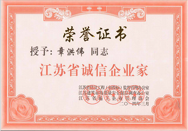 2014年誠信企業家榮譽證書